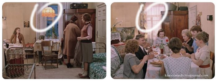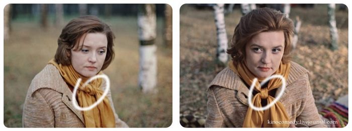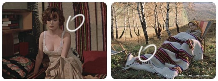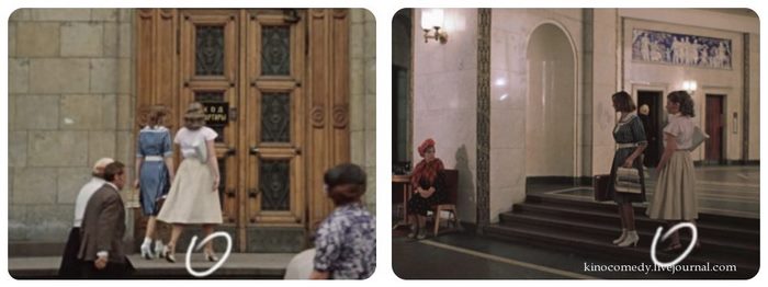 Первое, что мы заметили – это героиню актрисы Ирины Муравьевой. Около здания, при входе в него, на ее ногах белые туфли, а уже внутри актриса носит черные.