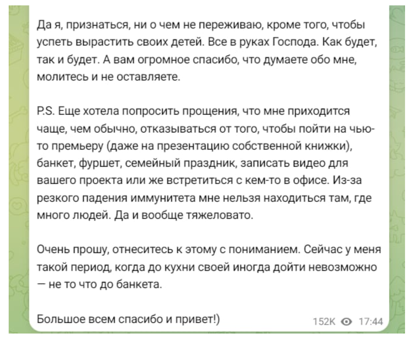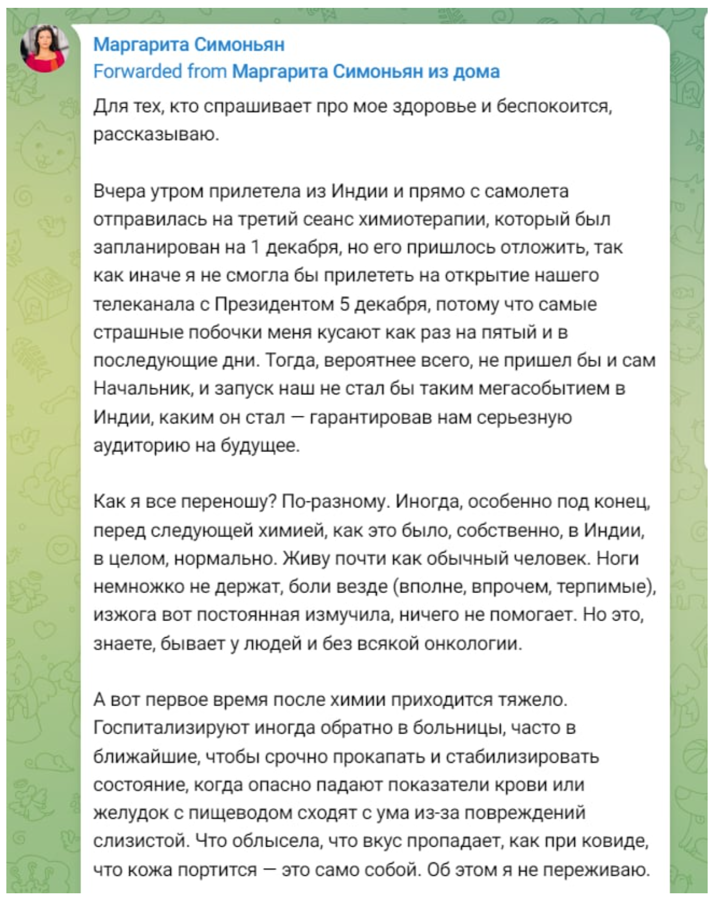 При этом в ее словах не было ни отчаяния, ни жалоб. Напротив, Маргарита подчеркнула, что, несмотря на тяжелое лечение и сложное эмоциональное состояние, она не собирается сдаваться. Сейчас в ее жизни появилась одна главная и безусловная цель — успеть вырастить детей, дать им опору, заботу и любовь, несмотря ни на какие обстоятельства. Именно дети стали для Симоньян источником сил и главным стимулом продолжать борьбу.